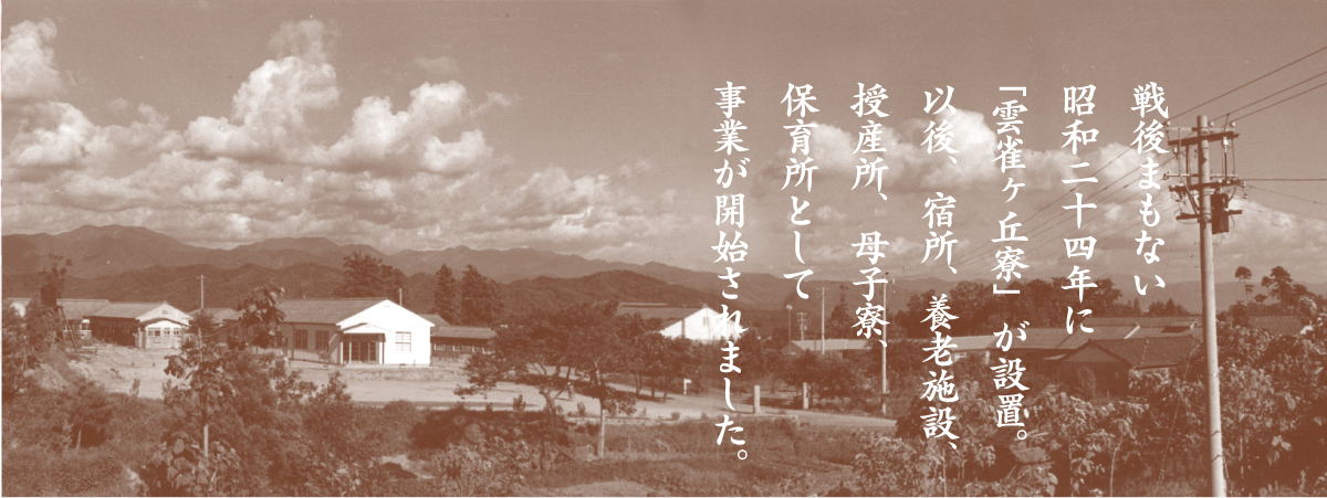 金津雲雀ヶ丘寮は、昭和24年4月1日に生活保保護法に基づく定員24世帯の県立宿所提供施設に始まり、平成31年で設立70周年を迎えました。昭和25年に“福井県雲雀ヶ丘寮”と命名され、その後高齢者、母子、保育、婦人保護の諸施設が設置されていきました。